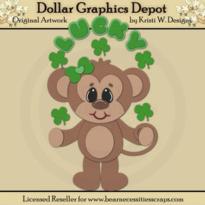 Esta colección única solo está disponible en Digital Craft Supplies. Este conjunto exclusivo incluye archivos de corte que se pueden usar para crear este adorable proyecto de manualidades del Día de San Patricio (que se muestra "terminado" en la vista previa): un lindo monito con un lazo verde para el cabello, tréboles y la palabra "Lucky".
