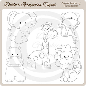 Esta colección incluye cinco adorables animales bebés de la jungla: un elefante, un mono, una jirafa, un hipopótamo y un león. Este conjunto contiene 5 sellos digitales.