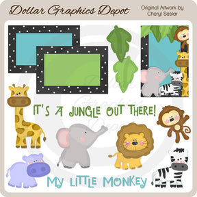 Esta gran colección incluye una jirafa, un hipopótamo, un elefante, un león, un mono, una cebra, dos hojas, tres frentes de tarjetas de 4" x 6" a juego y dos gráficos con palabras: "Hay una jungla ahí fuera" y " Mi pequeño mono." Este conjunto contiene 13 piezas (10 gráficos y tres imprimibles).