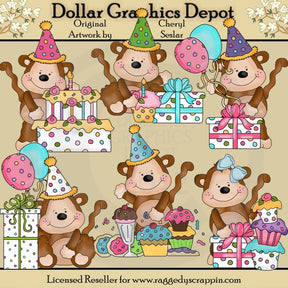 Esta colección incluye seis monos adorables, sombreros de cumpleaños, globos de fiesta, un pastel de cumpleaños en capas con vela, pastelitos glaseados con chispas, regalos de cumpleaños envueltos con bonitos lazos, confeti de fiesta, galletas decoradas y un helado con cereza encima. Este conjunto contiene 6 gráficos.