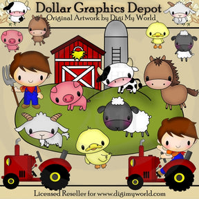 Esta ENORME colección incluye una escena de granja con un granero rojo, un silo y colinas cubiertas de hierba, un pequeño granjero con una horca, un tractor rojo, un pequeño granjero montado en un tractor rojo y doce animales de granja: dos cerdos, dos vacas. , dos caballos, dos cabras, dos ovejas y dos gallinas. BONIFICACIÓN: este conjunto también incluye ocho gráficos de palabras del "Old McDonald" (no se muestran en la vista previa). Este conjunto contiene 24 gráficos (incluidos los gráficos adicionales).