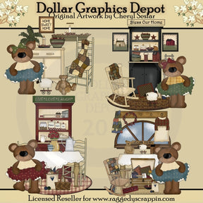 Esta colección única solo está disponible en Digital Craft Supplies. Este juego incluye cuatro ositos en casa, velas elegantes, una guirnalda de bayas de acebo, cuencos de arándanos y canela, una bonita planta, edredones elegantes, juguetes para tirar de ovejas, ositos de peluche antiguos, un cuadro elegante de "Hogar, dulce hogar", estrellas elegantes, un casa saltbox, escalera, mecedora, placa campestre "Bendice nuestro hogar", fotografías remilgadas de la casa saltbox, placa campestre "Vive, ama, ríe", un rodillo, un tamiz de harina, canela en un frasco, botes de harina, azúcar y té, un pastel casero, cafetera, taza de café, crema, "un jarrón pintado con bonitas flores rojas, una ventana campestre, una cesta, carretes de hilo, mesas de comedor campestres, sillas, una cómoda con delicias elegantes, alfombras tejidas , corona de bayas de acebo, ropa elegante, placa campestre "Welcome Friends" y placa campestre "Simplify". Este conjunto exclusivo contiene 4 gráficos.