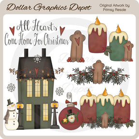 Esta colección incluye una bonita casa con forma de caja de sal con guirnalda de estrellas, bayas y corazones, linternas brillantes, un muñeco de nieve invernal y copos de nieve, un hombre de jengibre con bayas de acebo, una vela gruesa roja con una hoja de bayas de acebo, una vela verde gruesa con pan de jengibre. hombre y bayas de acebo, vegetación de bayas de acebo con un hombre de jengibre, una vela gruesa agrupada con vegetación de bayas de acebo y un hombre de jengibre, un adorno navideño con un muñeco de nieve, una estrella dorada y una palabra artística que dice "JOY", y un mensaje que dice "Todos los corazones vienen". Gráfico de arte de palabras "Home For Christmas". Este conjunto contiene 8 gráficos.