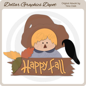 Esta colección incluye archivos de corte que se pueden usar para crear este adorable proyecto de artesanía de otoño (que se muestra "terminado" en la vista previa): un espantapájaros con un cuervo remilgado, coloridas hojas de otoño y un letrero de madera con la palabra "Feliz Otoño".