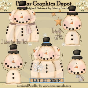 Esta colección incluye adorables muñecos de nieve de invierno con pequeños botones negros, sombreros de copa, bufandas de invierno, copos de nieve, estrellas doradas y tres incluyen las siguientes palabras: "I Love You This Much", "Twinkle Twinkle Little Star" y "Let It Snow". ". Este conjunto contiene 5 gráficos.