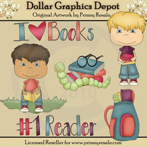 Esta colección incluye dos niños pequeños sosteniendo libros, cada uno con jeans azules, camisetas y zapatillas de deporte, en rojo, morado, azul y naranja, una pila de libros con un ratón de biblioteca y gafas para leer, una mochila con libros y un ratón de biblioteca mirando y dos coloridos gráficos de palabras: "I Love Books" y "#1 Reader". TENGA EN CUENTA: Este conjunto coordina con la colección "Bookworm Boys Backgrounds" . Este conjunto contiene 6 gráficos.