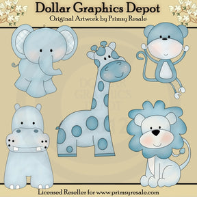 Esta colección incluye cinco adorables animales de la jungla de color azul celeste: un elefante, un mono, una jirafa, un hipopótamo y un león. Este conjunto contiene 5 gráficos.