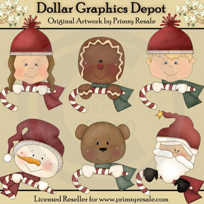 Esta colección incluye una niña con un gorro y una bufanda rojos de invierno, un hombre de jengibre con una bufanda verde, un niño con un gorro rojo de invierno y una bufanda verde, un muñeco de nieve con un gorro y una bufanda rojos de invierno, un osito con un gorro verde bufanda, Papá Noel con un gorro y una bufanda rojos de Papá Noel, y muchos bastones de caramelo a rayas rojas y blancas. Este conjunto contiene 6 gráficos.