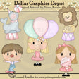Esta colección incluye una niña comiendo algodón de azúcar, un payaso montando un monociclo, una niña sosteniendo globos de colores, un león sentado en un accesorio de circo y una foca balanceando una pelota mientras está de pie sobre un accesorio de circo. Este conjunto contiene 5 gráficos.