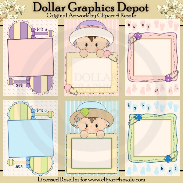 Esta colección incluye seis frentes de tarjetas de anuncio de bebé de 5 x 7: tres tarjetas de niña: una con sonajeros y palabras artísticas "It's A Girl", otra con una dulce niña y alfileres, y otra con alfileres, huellas rosas de bebé y Arte con palabras "Bebé" y tres tarjetas de bebé niño: una con sonajeros para bebés y arte con palabras "Es un niño", otra con un dulce bebé y otra con alfileres de bebé, huellas azules de bebé y arte con palabras "Bebé". Este conjunto contiene 6 cartas.