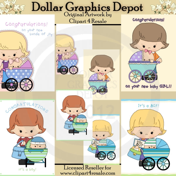 Esta colección incluye ocho frentes de tarjetas de bebé de 5x7, con mamás y bebés en cochecitos de bebé; dos tienen letras de niña: "Felicitaciones por tu nuevo paquete de alegría" y "Felicitaciones por tu nueva niña", dos tienen letras de niño: "Felicidades... es un niño" y "Es un niño", y cuatro se han dejado en blanco para que usted pueda personalizarlos. Tenga en cuenta: Este conjunto se coordina con las colecciones "Baby Carriage - Clip Art" y "Baby Carriage - Digital Stamps". Este conjunto contiene 8 cartas.