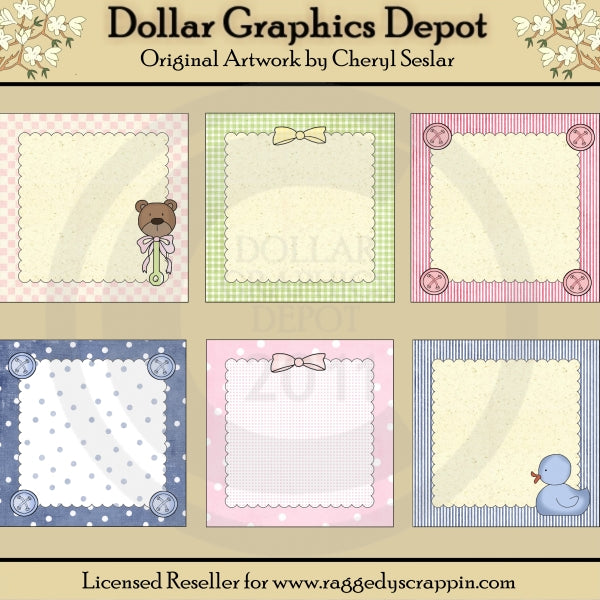 Esta colección incluye seis entrantes de 6" x 6", con bonitos lazos, pequeños botones, un sonajero de osito de peluche, un pato de goma y bonitos bordes festoneados con patrones de lunares, rayas y cuadros. Los colores incluyen: rosa, crema, azul, blanco, verde, amarillo y marrón. ¡Estos iniciadores son tan versátiles para tantos proyectos! Se pueden usar para tarjetas de felicitación, páginas de álbumes de recortes de 6" x 6", frentes de latas de pintura de un galón, bloques de vidrio, cuadros de texto, imanes, azulejos, posavasos, etiquetas de regalo, adornos para bolsos y mucho más. Este conjunto contiene 6 imprimibles.