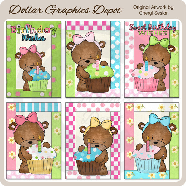 Esta colección incluye seis frentes de tarjetas de 5x7 con lindos ositos, bonitos lazos para el cabello, pastelitos glaseados con velas y dos tienen las siguientes palabras: "Dulces deseos de cumpleaños" y "Deseos de cumpleaños". Los patrones incluyen: lunares, cuadros, florales y rayas. Este conjunto contiene 6 cartas.