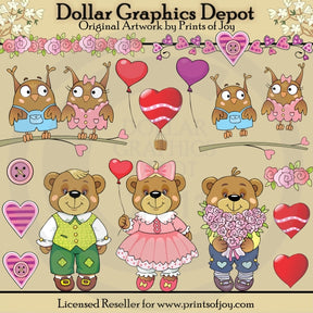 Esta gran colección incluye un osito con pantalones de vestir, una camisa de vestir y un chaleco, una osita con un bonito vestido rosa, un lazo para el cabello a juego y un globo en forma de corazón, un osito con jeans, una camisa de manga larga y un ramo de flores en forma de corazón, un corazón rojo, un corazón rojo con una cinta rosa, un corazón a rayas rosa y morado, un corazón a rayas rosa y morado con un botón, un botón rosa, un detalle de rosa rosa, un borde de rosa rosa, un borde festoneado en forma de corazón, un globo rojo en forma de corazón, un globo morado en forma de corazón, un globo aerostático en forma de corazón, una bonita rama de árbol, un niño búho con un mono, una niña búho con un bonito vestido rosa y un lazo para el cabello, y un niño y una niña búho sentado juntos en la rama de un árbol. Este conjunto contiene 18 gráficos.