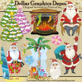 Esta colección incluye un árbol de Navidad decorado con nieve, luces navideñas y una estrella dorada en la parte superior, un árbol de Navidad decorado en rosa con nieve, luces navideñas y una estrella rosa en la parte superior, un árbol de Navidad sin decorar con nieve, una chimenea con leña. fuego y medias colgadas, Papá Noel sentado en una silla, Papá Noel saludando con un saco lleno de juguetes navideños, una cara de Papá Noel, un Papá Noel tropical con pantalones cortos hawaianos, una tabla de surf y un batido tropical con una sombrilla, una palmera decorada árbol con regalos de Navidad envueltos en la arena, una bonita flor rosa y una bonita flor azul. Este conjunto contiene 11 gráficos.