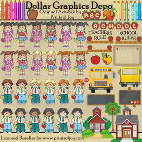 Esta ENORME colección incluye veinticuatro niños y niñas escolares, cada uno con mochilas y loncheras, trece lápices de colores, dos casas escolares, dos autobuses escolares, un manzano, una pizarra negra, una pizarra negra sobre un caballete, con tres "ABC" rojos. manzanas, una pizarra de borrado en seco con manzanas rojas y la palabra "123 - ABC", una regla con dos manzanas rojas, una regla con dos manzanas rojas y la palabra "Reglas escolares", una regla con dos manzanas rojas y "Regla de los profesores" arte de palabras, una manzana roja, una manzana roja con puntadas, una manzana Golden Delicious, una manzana roja con un ratón de biblioteca leyendo un libro, un gráfico de palabras de manzana roja "Escuela" y un gráfico de palabras de manzana roja "ABC". Este conjunto contiene 54 gráficos. TENGA EN CUENTA: Este conjunto coordina con la colección " School Daze Backgrounds and Borders ".