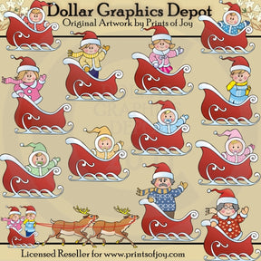 Esta gran colección incluye a una mamá, un papá, una abuela, un abuelo, dos niños, dos niños pequeños y cuatro bebés en bonitos trineos rojos, con trajes de invierno, abrigos, gorros, bufandas, manoplas y chupetes, y una mamá y un papá de pie en un Bonito trineo rojo, tirado por dos renos. Este conjunto contiene 13 gráficos.