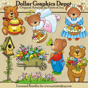 Esta colección incluye un osito adorable, con un bonito lazo y un tarro de miel pintado, un ángel oso con bonitas alas, un halo dorado, un vestido de lunares y una cesta de flores primaverales, un osito con un bonito vestido de rayas, un moño para el cabello y una canasta de flores primaverales, un osito con un ramo de coloridas flores primaverales, un osito con un overol de mezclilla azul y una linda mariposa en la nariz, flores silvestres que crecen en un prado cubierto de hierba, una carretilla de madera llena de hermosos flores primaverales y una bonita casita para pájaros pintada con una enredadera de hiedra. Este conjunto contiene 8 gráficos.