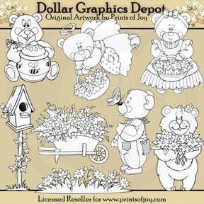 Esta colección incluye un osito adorable, con un bonito lazo y un tarro de miel, un ángel oso con bonitas alas, una aureola, un vestido de lunares y una cesta de flores primaverales, un osito con un bonito vestido de rayas y un lazo para el pelo. , y una canasta de flores primaverales, un osito con un ramo de flores primaverales, un osito con un mono y una linda mariposa en la nariz, flores silvestres que crecen en un prado cubierto de hierba, una carretilla llena de hermosas flores primaverales y una bonita pajarera con una enredadera de hiedra. Este conjunto contiene 8 sellos digitales.