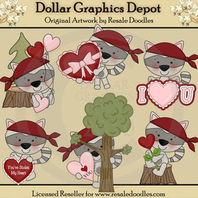 Esta colección incluye seis pequeños mapaches adorables, pañuelos rojos, globos rojos y rosados en forma de corazón, árboles forestales, tocones de árboles, un corazón rojo con volantes rosados y un lazo rosa, arte con la palabra "Te amo", un corazón rojo con rayas blancas. volantes y una palabra que dice "Me has robado el corazón", un corazón rosa, con una palabra que dice "Te amo" y una flor roja en forma de corazón. Este conjunto contiene 6 gráficos.