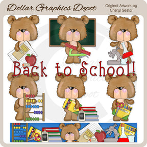 Esta colección incluye seis adorables ositos escolares, una manzana roja, un bloc de notas, una caja de lápices, una pizarra, una regla, un transportador, un compás, un microscopio, un vaso de precipitados, un matraz, un ábaco, una botella de pegamento, un caja de lápices de colores, una pila de libros escolares, un par de tijeras, una caja de marcadores de colores, un gráfico de palabras "Regreso a la escuela" y un borde escolar a juego. Este conjunto contiene 8 gráficos.