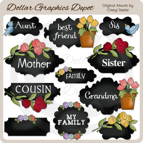 Esta colección incluye once marcos de pizarra "My Gals", con flores coloridas, rosas de tallo largo, vasijas de barro llenas de tulipanes, pájaros azules y las siguientes palabras en arte: "Tía", "Mejor amiga", "Hermana", "Madre, " "Hermana", "Familia", "Prima", "Abuela" y "Mi familia". Este conjunto contiene 11 gráficos.