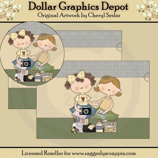 Esta colección incluye un juego de latas de pintura de un galón: envoltorio frontal, envoltorio posterior y tapa, un fondo tricolor: cuadros azul y tostado, cuadros beige y dorado y verde con estrellas negras, dos lindas chicas que hacen álbumes de recortes, una cámara, un rollo de película, papeles para álbumes de recortes, cinta, tijeras, una botella de pegamento, marcadores de colores y un paquete de etiquetas sucias. Este juego contiene 3 envoltorios.