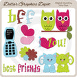 Esta colección incluye lindos amigos búhos sentados en la rama de un árbol, dulces amigos gatitos, corazones rosados, flores coloridas, un teléfono celular con el texto "¿Qué hacemos después de la escuela?" en la pantalla y tres gráficos coordinados con palabras: "BFF ", "Te amo" y "Mejores amigos". Este conjunto contiene 8 gráficos.