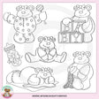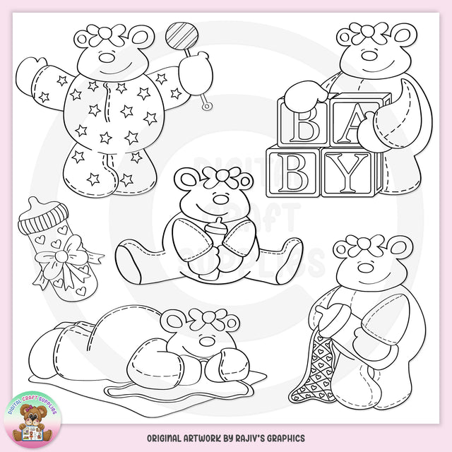 This collection includes five adorable baby bears with footsie pajamas, hair bows, baby bottles, a baby rattle, baby blankets, and baby blocks. This set contains 6 digital stamps.