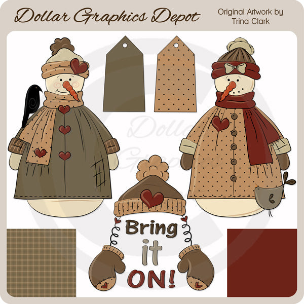 Esta colección incluye un adorable muñeco de nieve con abrigo de invierno, gorro, bufanda, manoplas y un cuervo negro, una adorable dama de nieve con abrigo de invierno, gorro, bufanda, manoplas y un pajarito, un gorro de invierno con manoplas y "Trae It On", dos papeles a juego y dos etiquetas de regalo a juego. TENGA EN CUENTA: Este conjunto coordina con las colecciones "Bring It On - Scrap Papers", "Bring It On Tags" y "Bring It On Labels" . Este conjunto contiene 7 piezas (3 gráficos y 4 imprimibles).