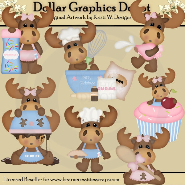 Esta colección única solo está disponible en Digital Craft Supplies. Este juego incluye siete adorables alces horneados, con lindos delantales navideños, gorros de chef y lazos para el cabello, un pastel recién horneado, un pastelito glaseado con chispas y una cereza, una manga pastelera con glaseado, un batidor, un tazón para mezclar con "Merry "Navidad", un saco de harina, una bolsa de azúcar, una botella de extracto de vainilla, un rodillo de madera, un frasco de chispas de colores, una cuchara de madera y un tazón para mezclar con masa de chocolate. Este conjunto exclusivo contiene 7 gráficos.