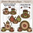 Esta colección incluye piezas para servir café bellamente pintadas: dos tazas y platillos con un pequeño corazón y un arte con palabras que dice "La buena conversación es tan estimulante como el café y tan difícil de dormir después", un juego de azúcar y crema con una taza y un platillo, un cafetera con tazas y platillos, una bonita fuente con tazas y platillos, y una taza y platillo con corazoncitos, líneas de puntos y la siguiente palabra en arte: "Una mañana sin café es como dormir". Este conjunto contiene 5 gráficos.