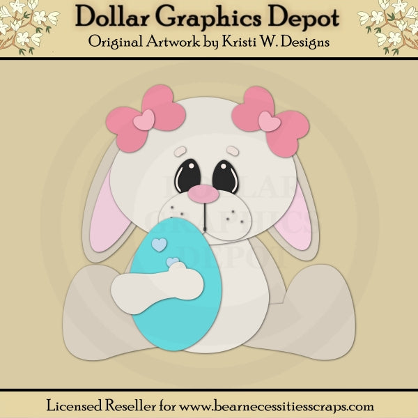Esta colección única solo está disponible en Digital Craft Supplies. Este conjunto exclusivo incluye archivos de corte que se pueden usar para crear este adorable proyecto de artesanía de Pascua (que se muestra "terminado" en la vista previa): un lindo conejito de Pascua con bonitos lazos rosados para el cabello y un huevo de Pascua pintado con pequeños corazones.