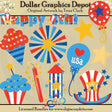 Esta colección incluye un cono de helado, un pastelito con una vela en forma de estrella, un molinete, un petardo, un cohete, el sombrero del Tío Sam, un globo con estrellas, un globo con un corazón y la palabra "EE.UU.", dos estrellas doradas y un gráfico de palabras "Happy 4th", todo con muchas rayas y estrellas rojas, blancas, azules y doradas. TENGA EN CUENTA: Este conjunto coordina con la colección "Happy 4th - Scrap Papers" . Este conjunto contiene 12 gráficos.