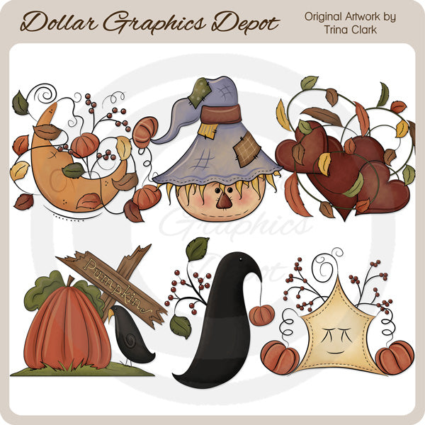 Esta colección incluye una luna de cosecha con coloridas hojas otoñales, mini calabazas y bayas, una linda carita de espantapájaros, un trío de corazones con coloridas hojas otoñales, una calabaza en un terreno de césped con un cuervo negro y un canto de madera que dice: "Calabazas", un cuervo negro con hojas, bayas y una mini calabaza, y una estrella con mini calabazas y bayas. Este conjunto contiene 6 gráficos.