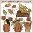 Esta colección incluye coloridas hojas de otoño, un letrero de madera que dice: "Cosecha tomillo" con una mazorca de maíz, zanahoria y tomates, una calabaza con girasoles y un cuervo negro, una calabaza con un letrero de madera que dice: "Da gracias". y una canasta tejida llena de calabazas y un girasol. Este conjunto contiene 5 gráficos.