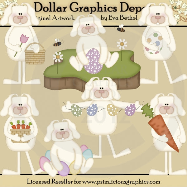 Esta colección incluye siete adorables conejitos de Pascua blancos: uno con una canasta tejida y un tulipán rosa, otro con un huevo de Pascua de lunares, otro con una canasta llena de zanahorias, uno sentado con muchos huevos de Pascua de colores y otro con una cuerda. de huevos de Pascua pintados, uno sosteniendo una zanahoria y el otro sentado en un trozo de césped con bonitas flores, abejorros y un huevo de Pascua pintado. Este conjunto contiene 7 gráficos.