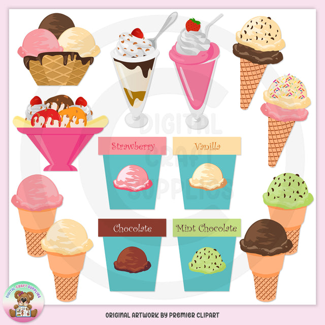 This one-of-a-kind collection is only available at Digital Craft Supplies. This large set includes lots of yummy ice cream shop treats: four pints of ice cream - chocolate, strawberry, vanilla, and mint chocolate, four wafer ice cream cones - chocolate, strawberry, vanilla, and mint chocolate, two waffle ice cream cones - chocolate and chocolate chip, and strawberry and vanilla with rainbow sprinkles, a Neapolitan waffle bowl sundae with hot fudge, a banana split with bananas, vanilla ice cream, strawberry syrup, caramel syrup, hot fudge, whipped cream, cherries, and nuts, a hot fudge and caramel sundae with whipped cream, nuts, and a cherry on top, and a strawberry milkshake with whipped cream and a strawberry on top. This exclusive set contains 14 graphics.
