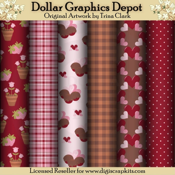 Esta colección incluye seis papeles de desecho de 12" x 12" - "My Valentine". Los patrones incluyen: rosas rosadas y fresas, cuadros, cerezas y corazones cubiertos de chocolate, cuadros a cuadros, corazones de San Valentín y lunares. TENGA EN CUENTA: Este conjunto coordina con las colecciones gráficas "My Valentine 1" y "My Valentine 2" . Este juego contiene 6 papeles para álbumes de recortes.