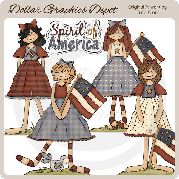 Esta colección incluye cuatro adorables chicas americanas, con bonitos vestidos patrióticos y lazos para el cabello a juego, parches de hierba, banderas estadounidenses, un dulce pajarito azul y un gráfico con la palabra "Spirit Of America". Este conjunto contiene 5 gráficos.