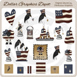 Esta gran colección incluye muchos gráficos americanos remilgados: un corazón, cuervos con sombreros patrióticos, una bandera estadounidense, una oveja, dos corazones en resortes, una estrella con un cuervo en carreras, una oveja en resortes, una lata de vela, una bandeja de hojalata con bayas, estrellas y velas en forma de pera, una pera, una maceta con cuervos en palos, un marco patriótico con una oveja y la palabra "Ewe SA", y seis mosaicos de fondo americanos en varios tamaños. Este conjunto contiene 21 gráficos.