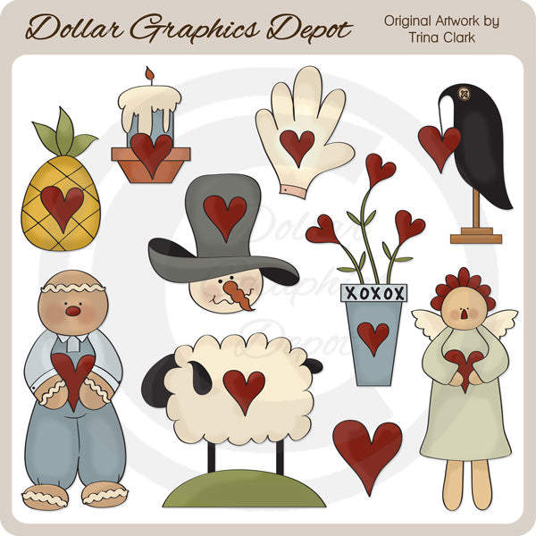 Esta colección incluye muchos elementos elegantes con pequeños corazones rojos: una piña, una vela en un candelabro, un muñeco de nieve con sombrero de copa, un guante, una maceta con flores en forma de corazón, un cuervo, un hombre de jengibre, una oveja en una colina cubierta de hierba, un corazón y un ángel bonito. Este conjunto contiene 10 gráficos.