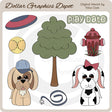 Esta colección incluye dos adorables cachorritos, una correa para perro, una boca de incendio, una pelota, un disco volador, un árbol y un gráfico con la palabra "Play Date". Este conjunto contiene 8 gráficos.