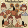Esta colección incluye cuatro dulces muñecos de trapo, con bonitos vestidos, lazos para el cabello, calabazas de otoño, cuervos negros y hermosos girasoles, y un trozo de césped con una calabaza de otoño, un cuervo negro y un girasol. Este conjunto contiene 5 gráficos.