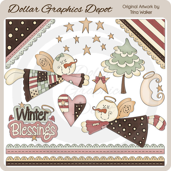 Esta gran colección incluye dos adorables ángeles de nieve con bonitos vestidos de patchwork, caras y alas cosidas, un pino nevado, un ángel lunar con una pequeña estrella, un corazón de patchwork, una estrella con un bonito lazo, muchas pequeñas estrellas doradas, dos bordes festoneados, dos esquinas festoneadas y un gráfico de palabras "Winter Blessings". Este conjunto contiene 12 gráficos.