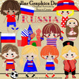 Esta colección incluye siete adorables muñecas rusas, cada una con lindos ojitos de botón, mejillas de colores, bocas cosidas y banderas rusas: una tiene un traje rojo y azul, chanclas y una bandera rusa, la otra tiene un bonito lunar rojo y blanco. vestido y un sombrero rojo, blanco y azul, uno tiene un vestido de rayas rojas, blancas y azules y lazos para el cabello azules, uno tiene un traje rojo, blanco y azul y un balón de fútbol, dos tienen bonitos vestidos rojos, blancos y azules. vestidos azules, y uno tiene un traje y un sombrero de Crossack ruso negro y rojo. Esta colección también incluye un gráfico de palabras "Rusia", la Catedral de San Basilio, una bonita muñeca Matryoshka rosa y marrón y una bandera rusa. Este conjunto contiene 11 gráficos.