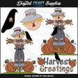 Esta colección incluye un espantapájaros en un parche de hierba con calabazas y un cuervo, un espantapájaros en un parche de hierba sentado sobre una calabaza grande, con calabazas y un cuervo, un cuervo con una estrella dorada, una cara de espantapájaros y un "Cosecha "Saludos" gráfico de arte de palabras. Este conjunto contiene 5 gráficos.