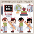 Esta colección incluye escolares con lápices, escolares con mochilas, un lápiz, una pizarra con la palabra "A Is For Apple", un globo terráqueo, una pila de libros con una manzana roja encima, una mochila y un "School Days". " arte de palabras. Este conjunto contiene 10 gráficos.