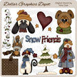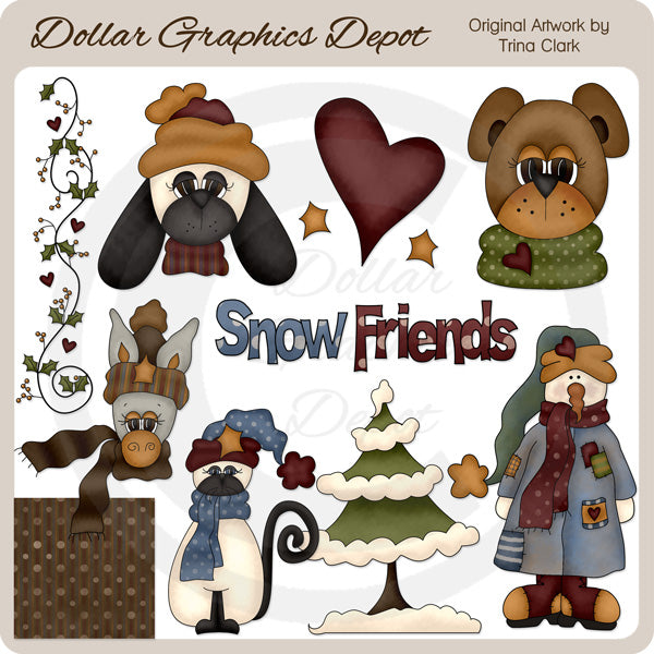 Esta colección incluye adorables amigos de invierno, todos abrigados para la nieve: un perro, un oso, un burro, un gato y un muñeco de nieve, un pino nevado, un corazón rojo con estrellas doradas, una bonita baya de acebo y un borde de corazón. un fondo de lunares y un gráfico de palabras "Snow Friends". Este conjunto contiene 10 piezas (9 gráficos y 1 fondo).