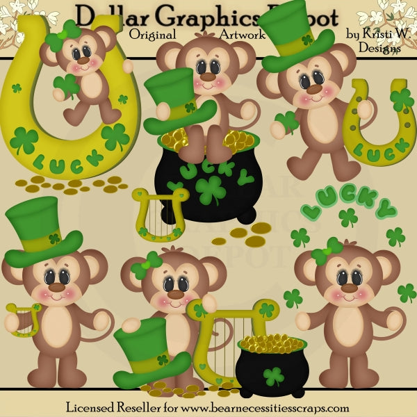 Esta colección única solo está disponible en Digital Craft Supplies. Este conjunto incluye seis adorables monos irlandeses, sombreros de duende, lindos lazos verdes para el cabello, herraduras doradas con tréboles y arte de palabras "Suerte", vasijas de oro, arpas doradas, monedas de oro, tréboles y arte de palabras "Suerte". Este conjunto exclusivo contiene 6 gráficos.